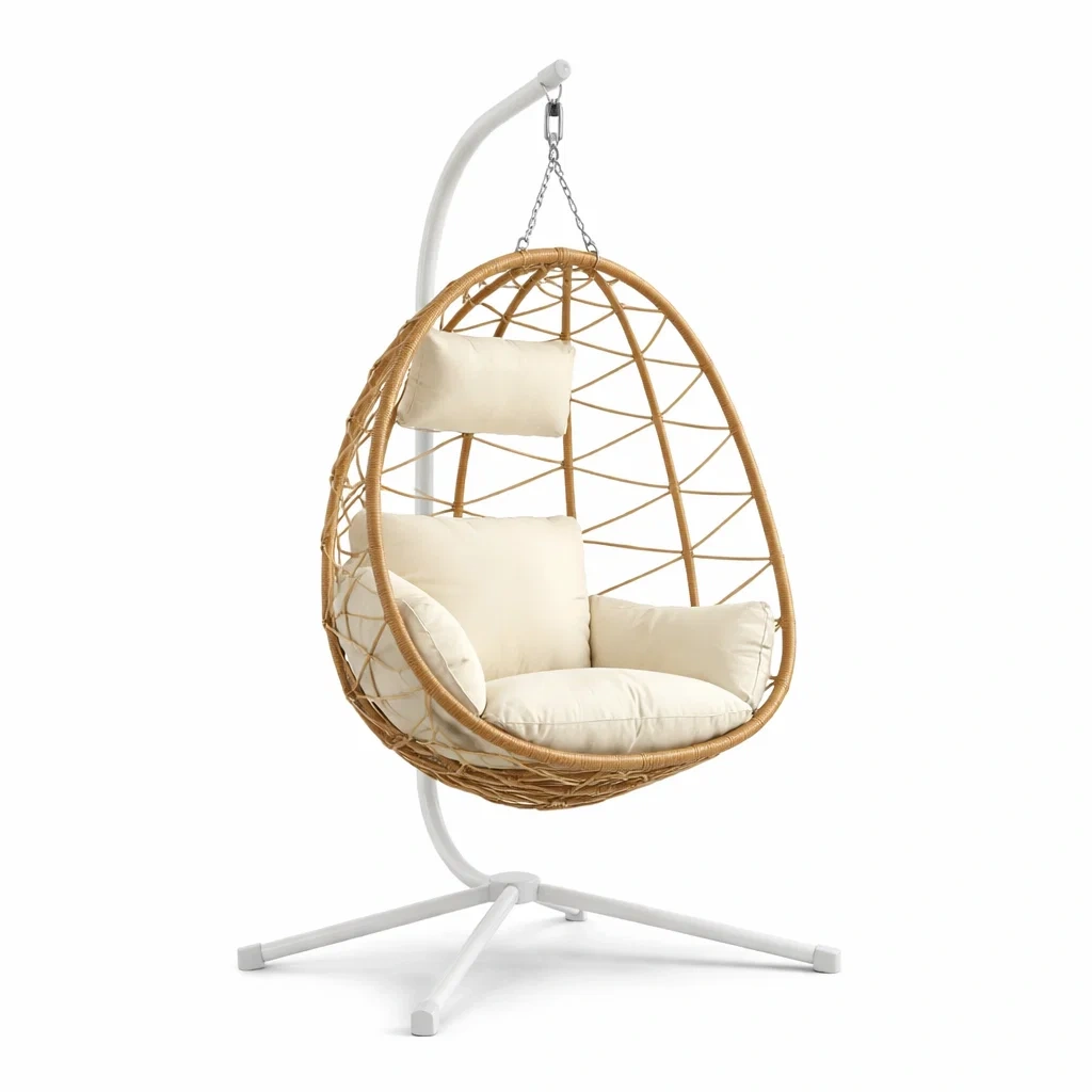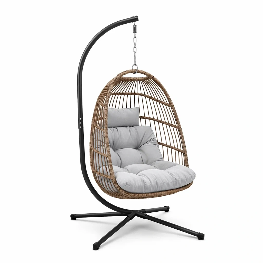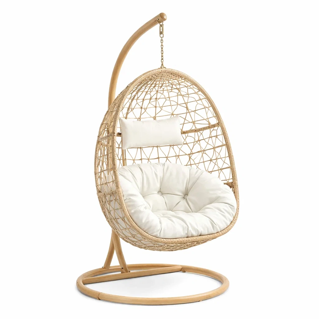 Fauteuil œuf suspendu en rotin avec support en acier et coussins amovibles