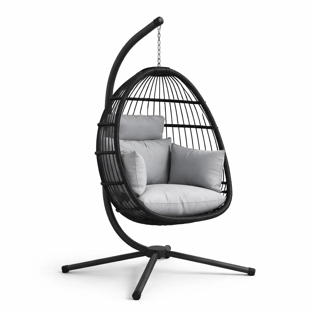 Fauteuil œuf suspendu en métal noir avec coussins gris