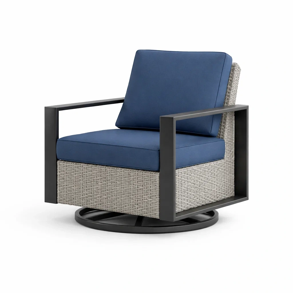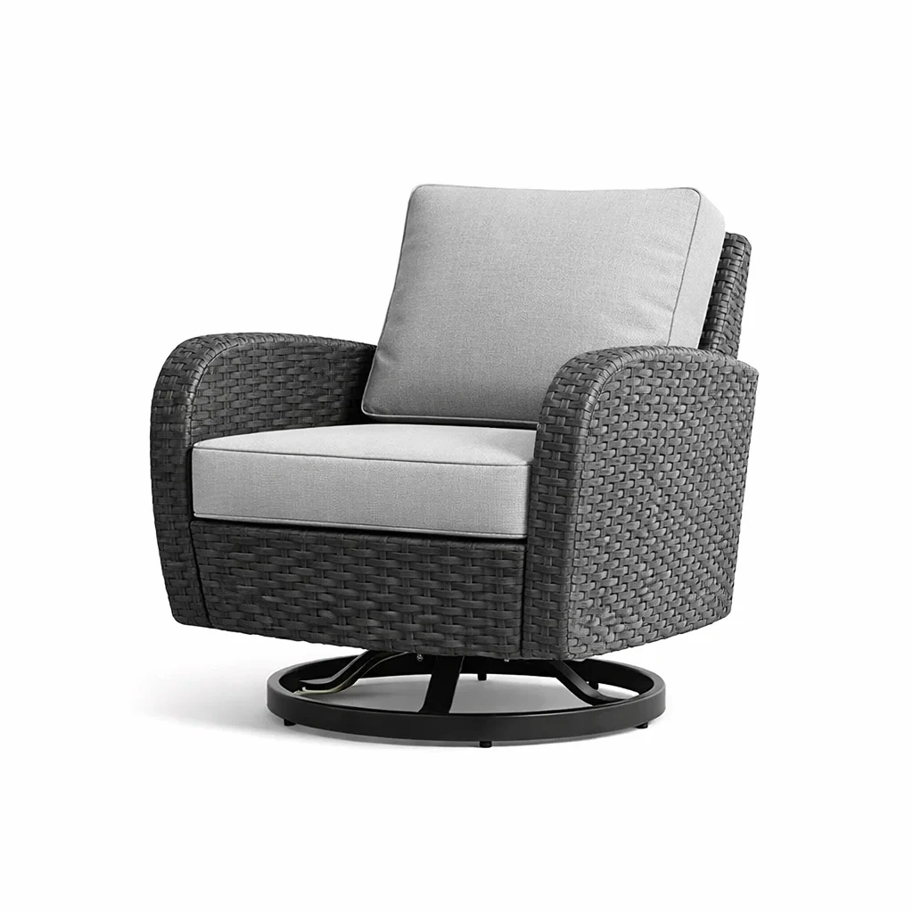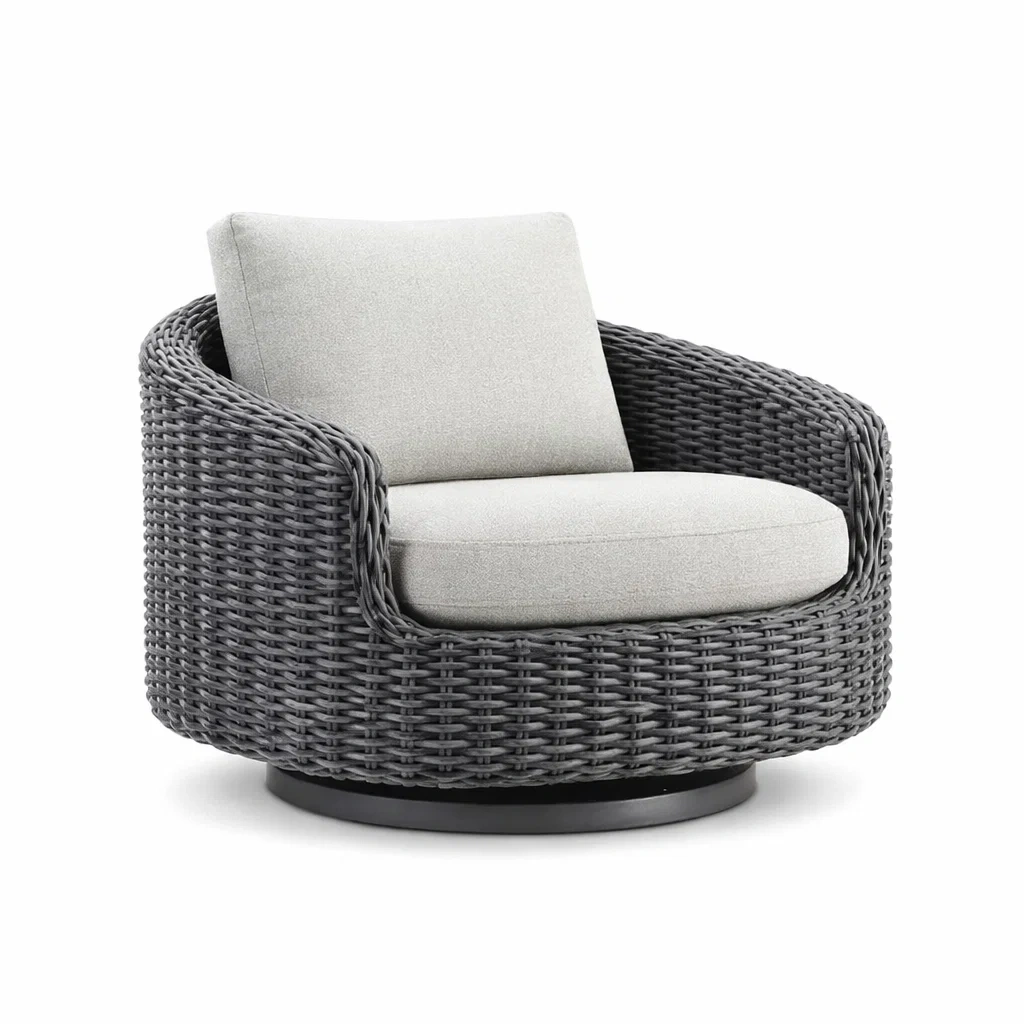 Fauteuil pivotant en résine tressée gris avec coussins en polyester