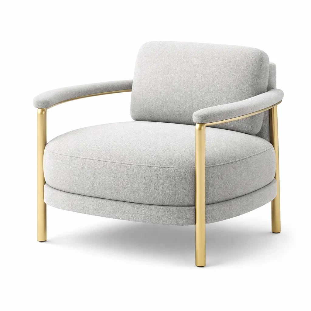 Fauteuil en tissu gris avec accoudoirs et pieds en métal doré
