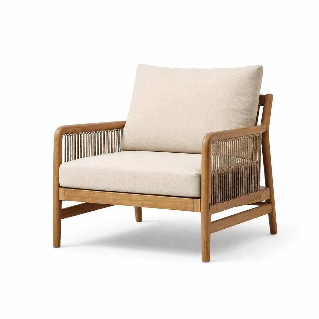 Fauteuil en bois de teck et tissu beige avec accoudoirs en corde