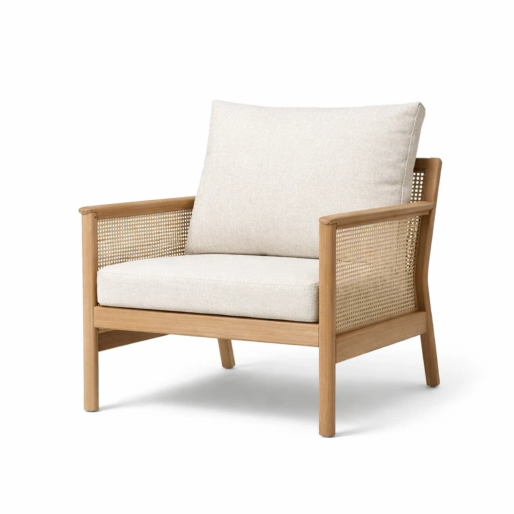 Fauteuil en bois avec coussins en tissu crème
