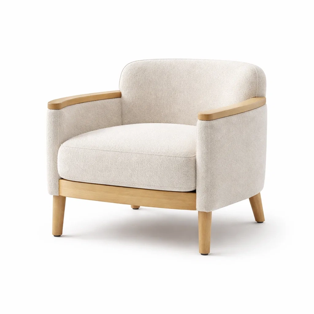 Fauteuil en tissu polyester beige avec accoudoirs et structure en chêne