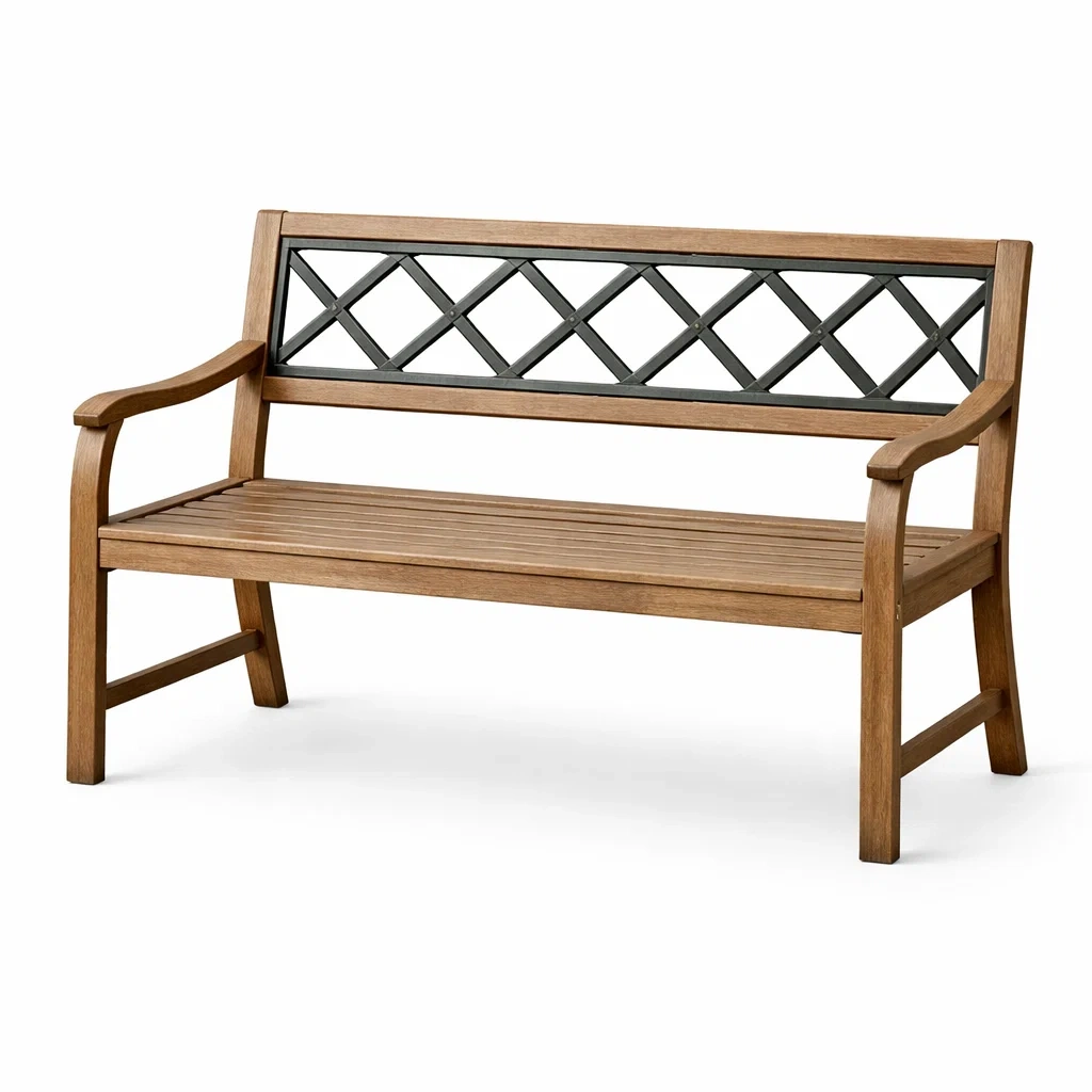 Ce banc est fabriqué à partir de bois d'acacia pour la structure principale et de fer forgé pour le dossier. Dimensions: 120 cm de long, 60 cm de large et 85 cm de haut. Poids net: 12.5 kg. Le dossier présente un motif treillis et les accoudoirs sont courbés. Il est résistant à l'eau et anticorrosion.