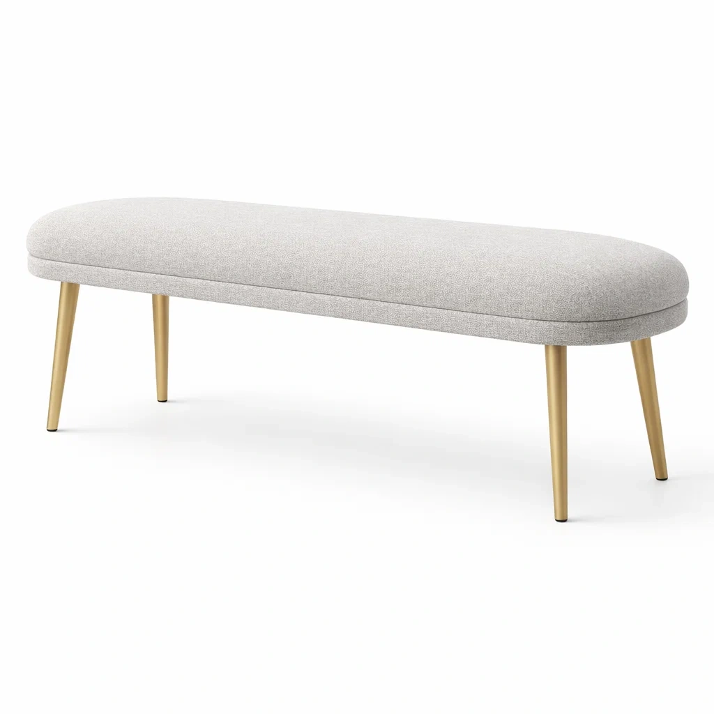 Ce banc est revêtu de tissu polyester durable, offrant une surface lisse et confortable. Les pieds en métal doré garantissent stabilité et style. Dimensions : longueur 140 cm, largeur 40 cm, hauteur 45 cm. Capacité de charge maximale de 150 kg. Hauteur d'assise de 45 cm. Entretien simple avec un chiffon humide recommandé, éviter les produits abrasifs pour préserver la surface.