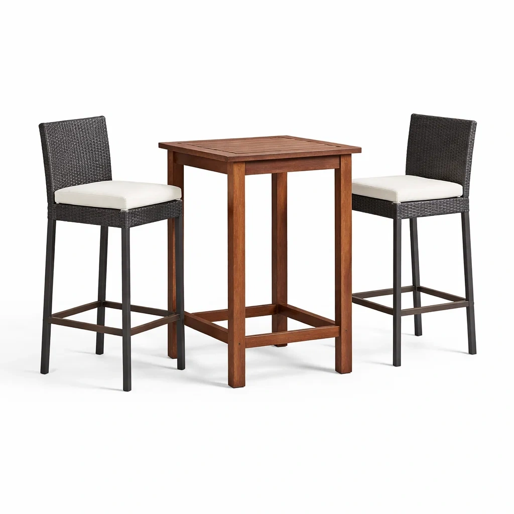 Ce set comprend une table haute fabriquée en bois d'acacia et deux chaises avec structure en acier et assise en polyrésine rotin. Les coussins des chaises sont en tissu polyester de couleur Beige.