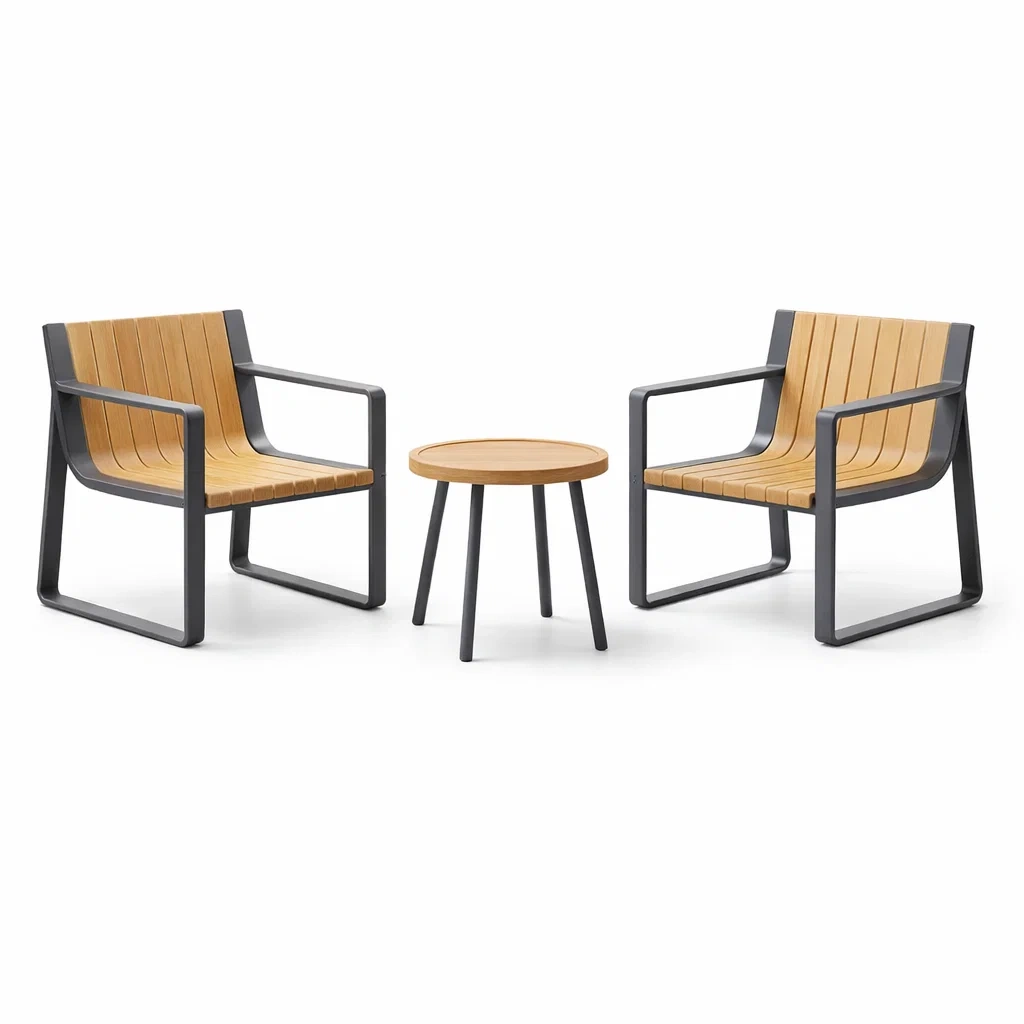 Structure en aluminium avec assise en bois d'acacia. Dimensions : fauteuils 65 cm de large, 70 cm de profondeur, 75 cm de hauteur. Table : diamètre 50 cm, hauteur 50 cm. Couleur Gris et Bois naturel. Poids total de l'ensemble : 15 kg. Chaque chaise supporte un poids maximum de 120 kg.
