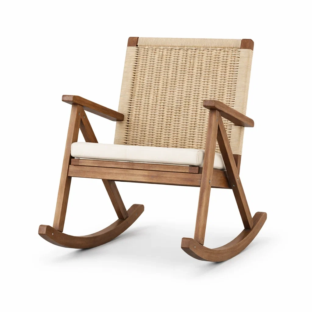 Fauteuil à bascule en bois d'acacia et rotin avec coussin crème 95x60x90 cm