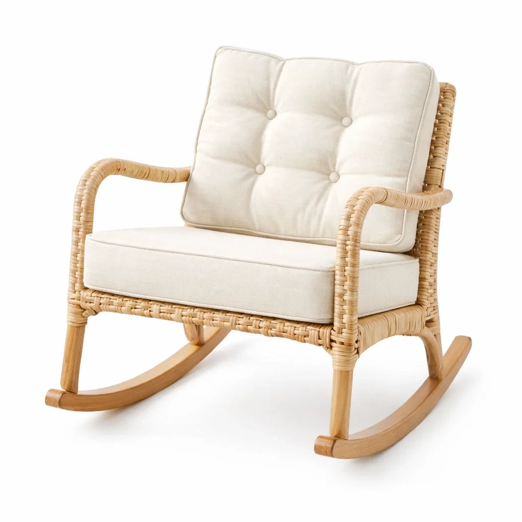 Fauteuil à bascule en rotin avec coussins en polyester beige