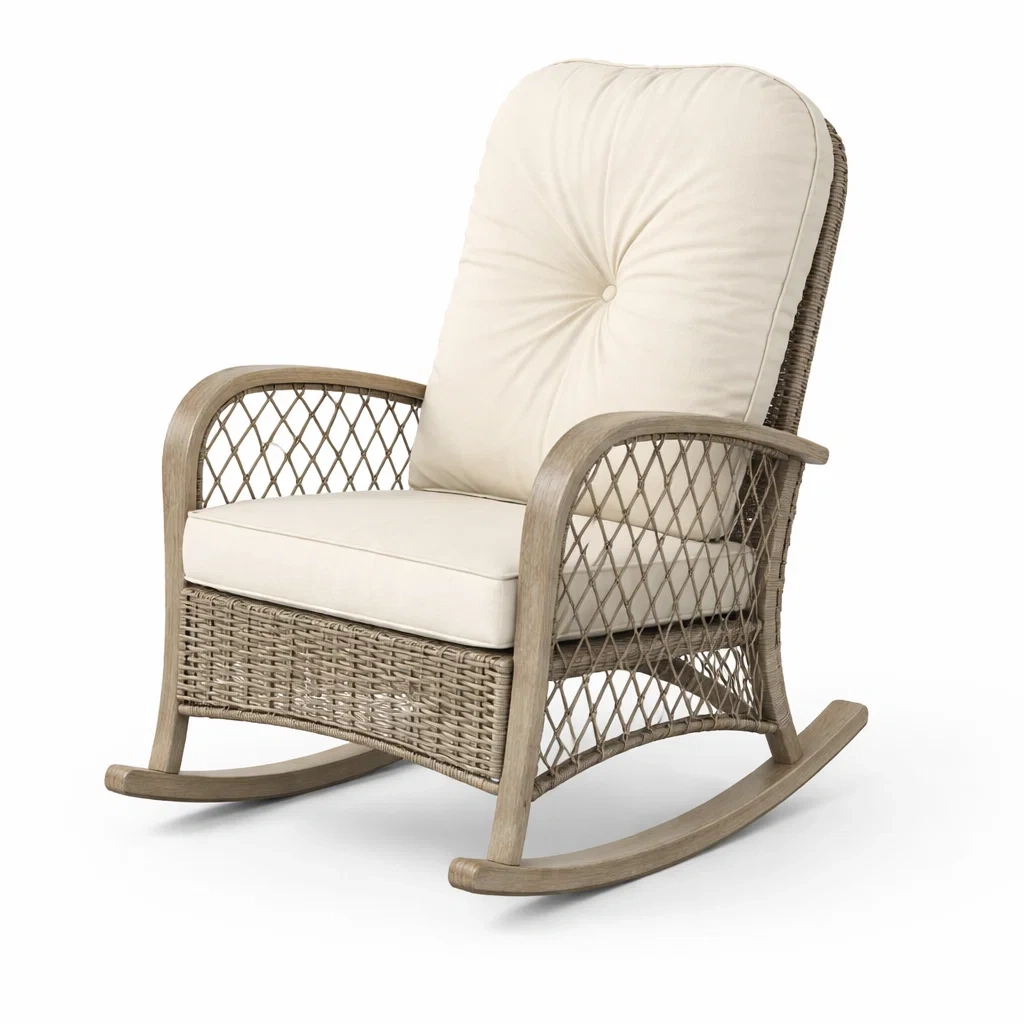 Fauteuil à bascule en rotin et bois clair avec coussin en polyester