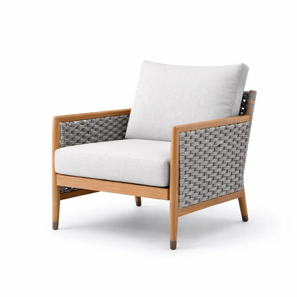 Matériaux : Structure en teck, tissu en polyester tissé à la main. Dossier et siège avec coussins rembourrés en mousse.