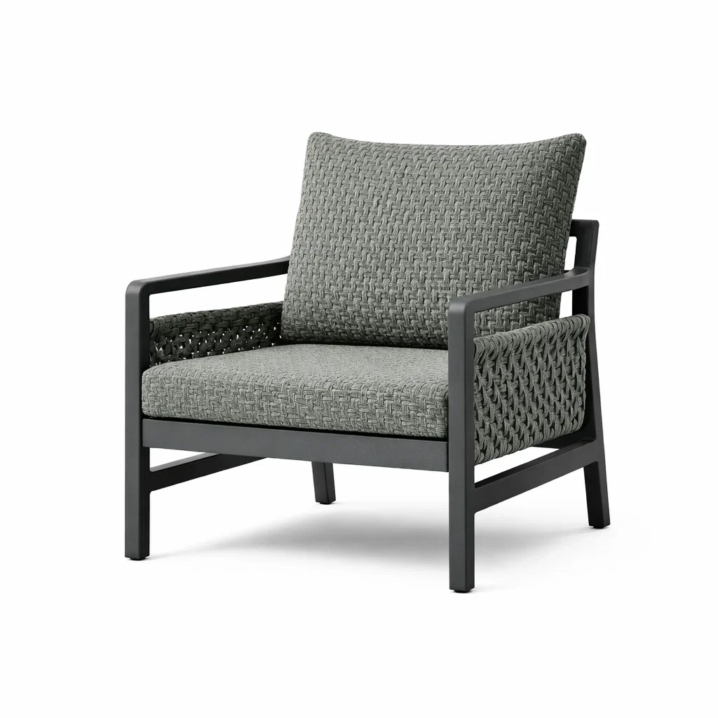 Structure en aluminium avec accoudoirs en corde tressée. Coussins recouverts de polyester, rembourrés de mousse polyuréthane. Couleur gris.