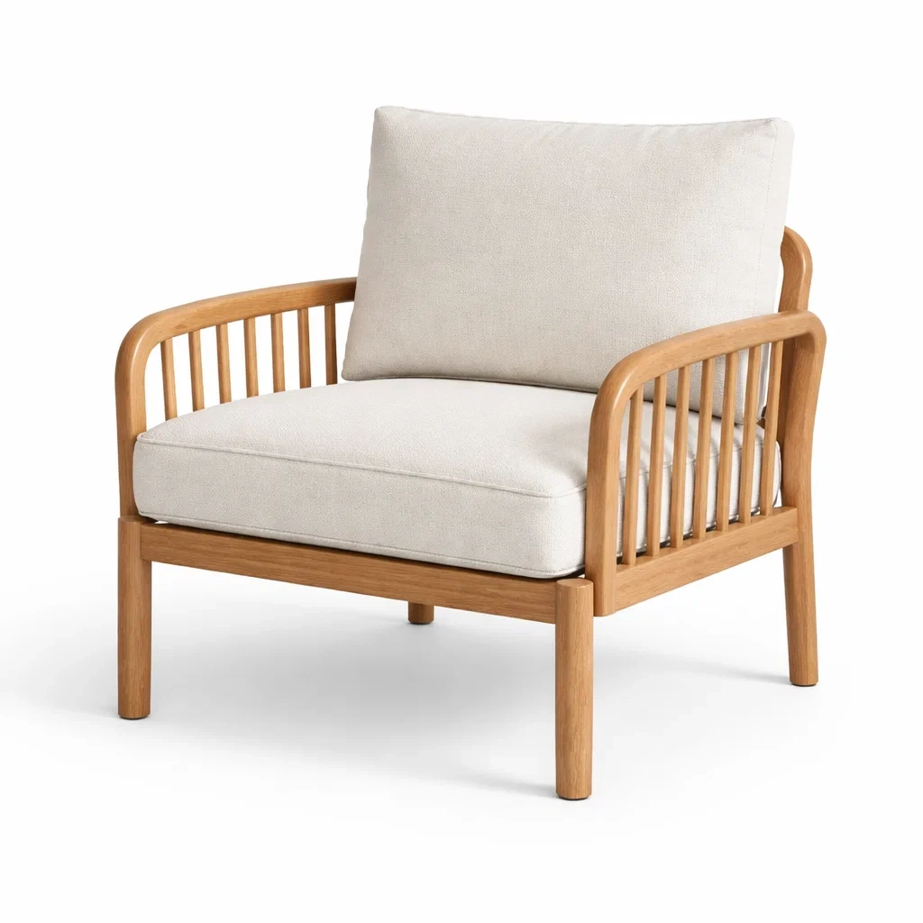 Ce fauteuil est fabriqué en bois avec des accoudoirs sculptés. Les coussins sont en tissu polyester rempli de mousse.
