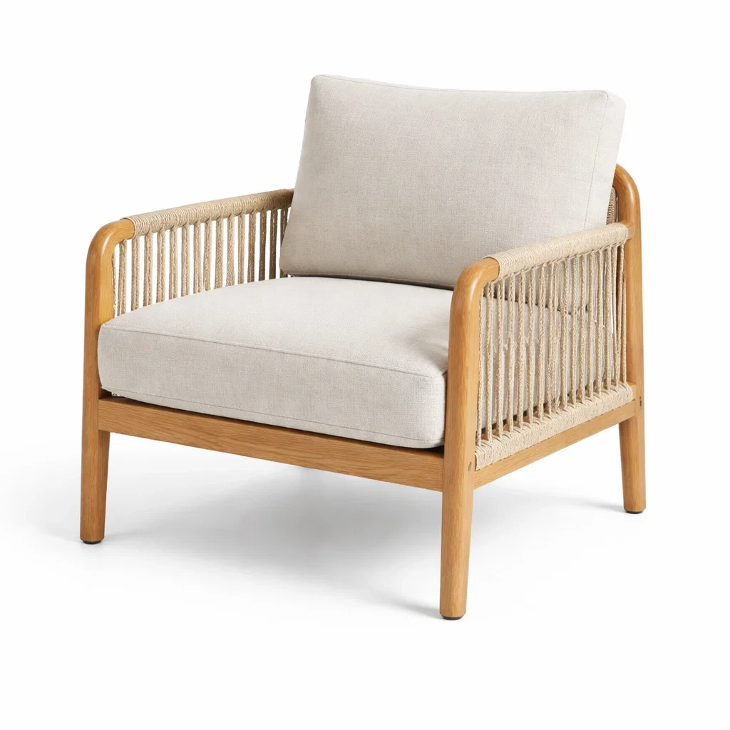- Matériau : Structure en bois d'acacia, détails en corde, assise et dossier en tissu de lin avec rembourrage en mousse.
