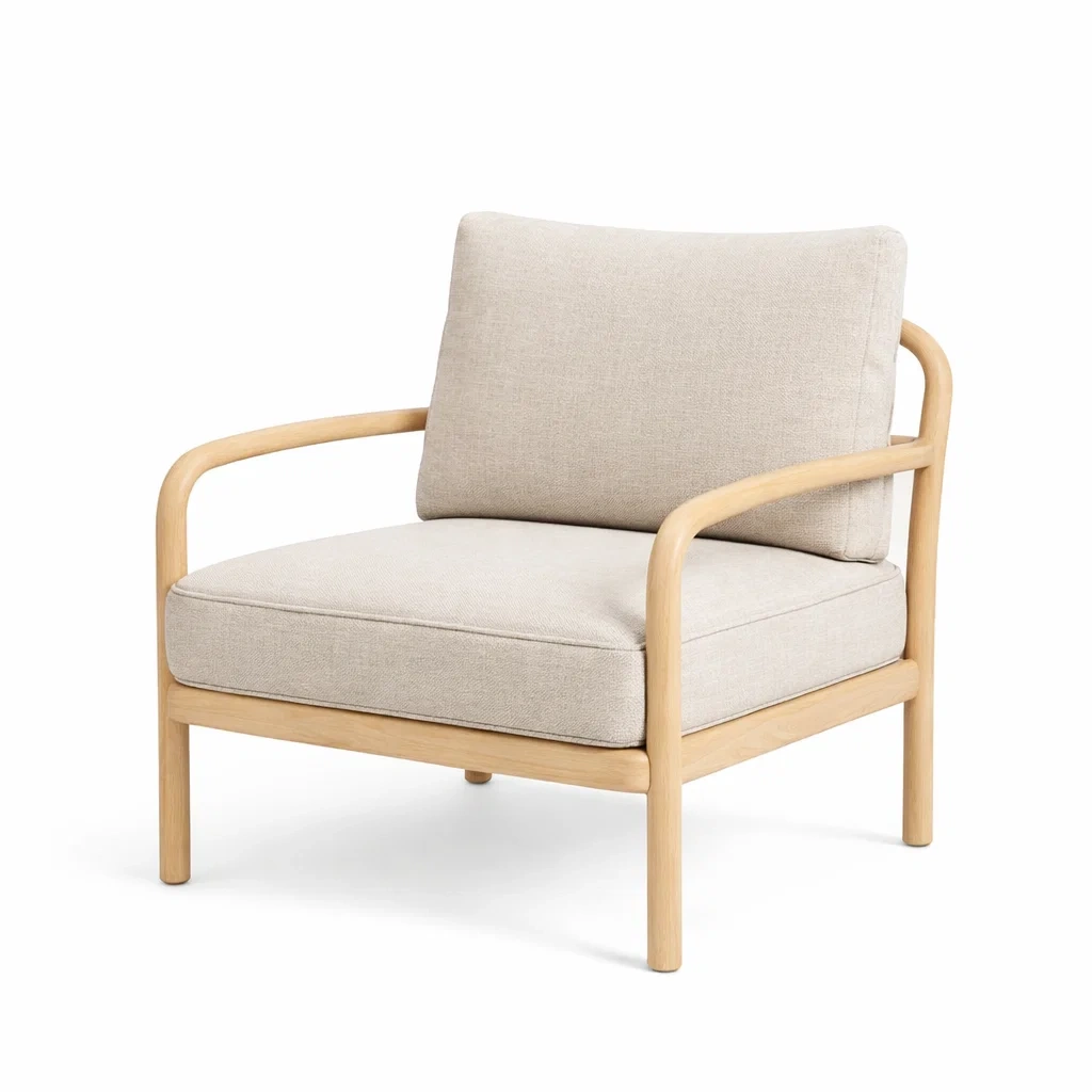 Fauteuil avec un cadre en bois naturel et un revêtement en lin.