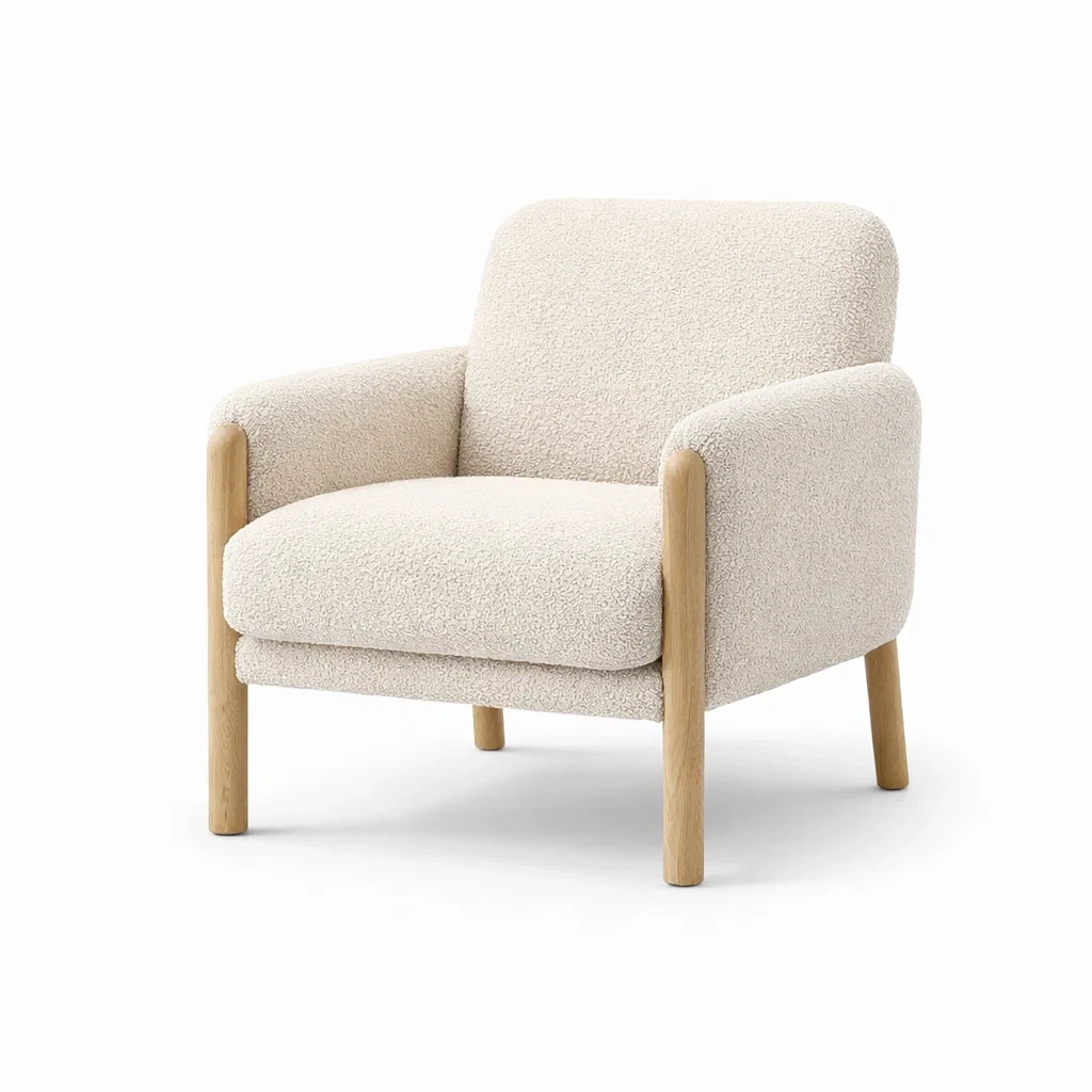 Ce fauteuil présente une assise en tissu bouclé, assurant une texture douce et agréable. Le cadre est fabriqué en bois de chêne massif, garantissant solidité et durabilité. Ses dimensions sont de 75 cm en hauteur, 85 cm en largeur et 90 cm en profondeur. La couleur est un blanc cassé. Le poids net du fauteuil est de 12 kg avec une capacité de charge maximale de 120 kg. Les accoudoirs sont fixes et le coussin est amovible pour un entretien simplifié. Nettoyage avec un chiffon humide est recommandé pour maintenir l'aspect du tissu. Éviter l'exposition directe au soleil afin de préserver la qualité du fauteuil.