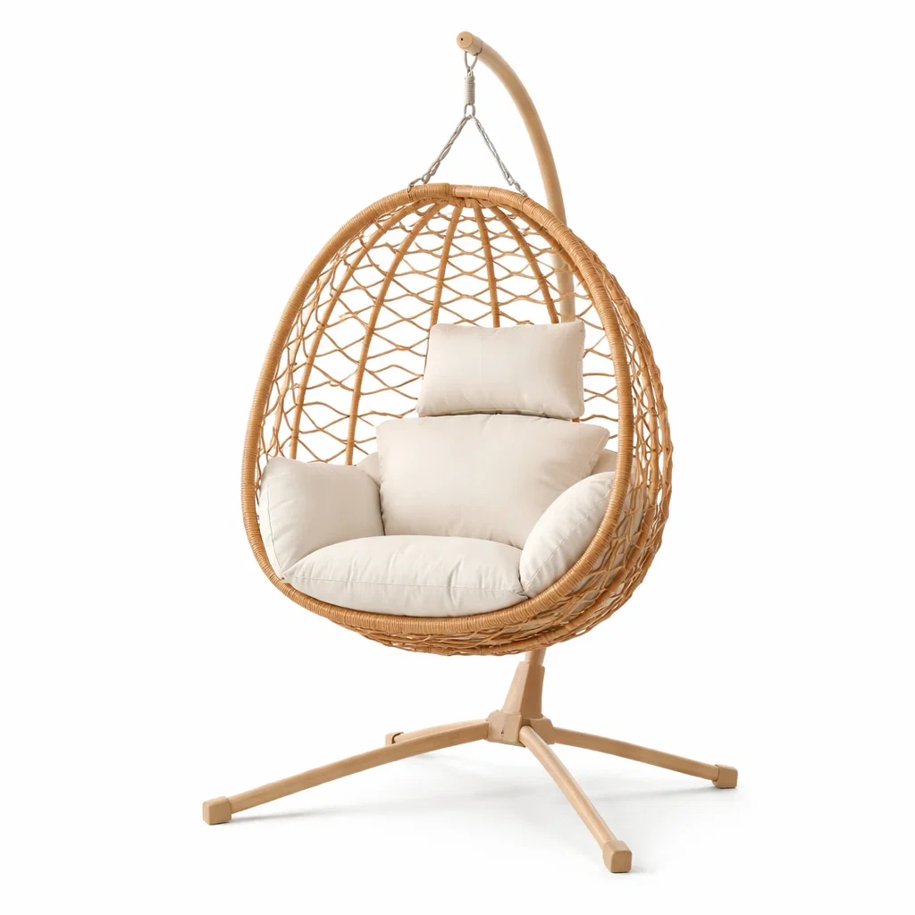 Ce fauteuil suspendu est doté d'un cadre en acier recouvert de rotin synthétique, adapté à un usage en extérieur. Le coussin est rembourré de fibres de polyester et peut être retiré pour faciliter le nettoyage. La structure est suspendue à une base en métal peint, offrant stabilité et sécurité.